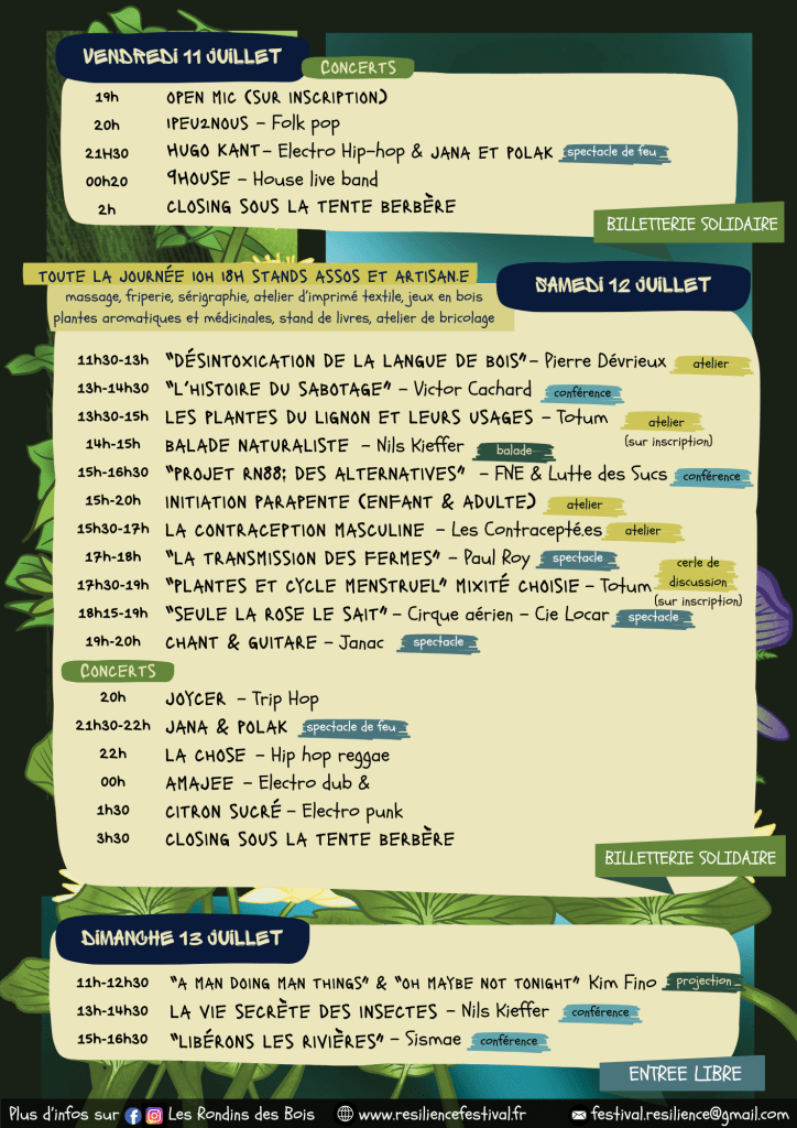 Le Résilience Festival, au Chambon-sur-Lignon (43), est un festival qui propose des concerts, de l’art de rue et des ateliers, conférences, tables rondes sur le thème de la transition écologique.